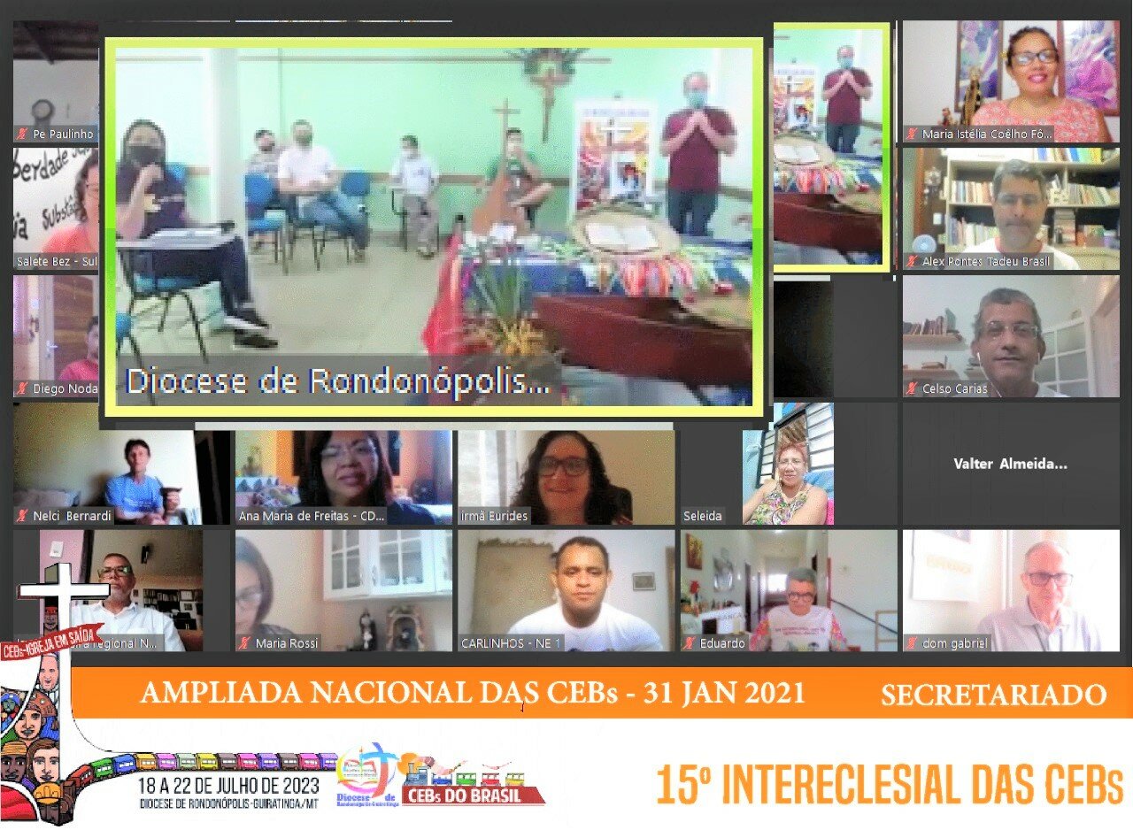 Neste final de semana, dias 30 e 31 de janeiro, a Equipe Ampliada das CEBs do Brasil está reunida com o Secretariado do 15º Intereclesial, assessores e convidados. A reunião ampliada das CEBs acontece anualmente, na diocese responsável pela acolhida do Intereclesial. O 15º acontecerá na cidade de Rondonópolis-MT, de 18 a 22 de julho de 2023 e tem como Tema: “CEBs: Igreja em Saída na busca da Vida Plena para Todos e Todas” e lema “Vejam! Eu vou criar novo céu e uma nova terra…” (Is 65,17ss). Este ano, em razão dos riscos de contaminação pela COVID 19 e das medidas de prevenção o encontro acontece de forma remota, pelas plataformas digitais. Estão participando aproximadamente 80 pessoas dos diversos regionais das CNBB. Também se fazem presentes Dom Juventino, bispo Rondonópolis/Guiratinga-MT, diocese anfitriã; Dom Gabriele, bispo de Floresta-PE, referencial das CEBs do Brasil e Dom Giovane Pereira de Melo, como convidado.
