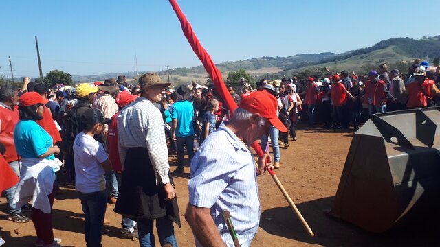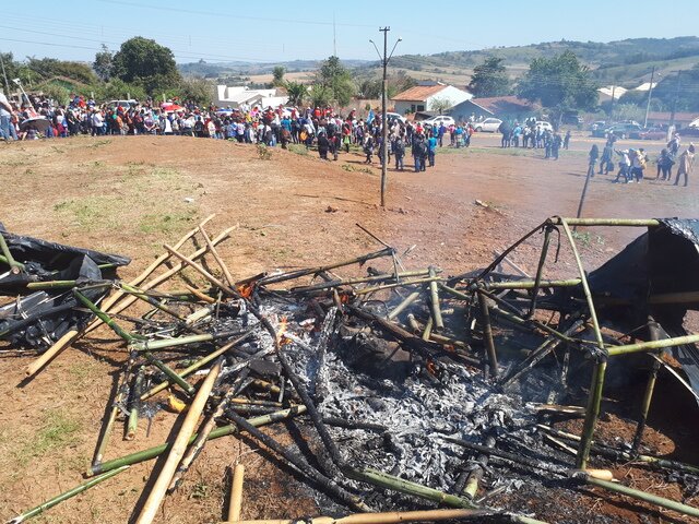 Num segundo momento o acampamento simbólico foi destruído. Homens armados tiraram as famílias e ilustraram a violência a qual estão submetidas as famílias acampadas no Paraná, constantemente sob ameaça de despejo. Os ocupantes foram expulsos, o fogo tomou conta do acampamento simbólico e uma máquina destruiu o local. relembrando o despejo de Alecrim, em Pinhão, que nos dias 1° e 2 de dezembro de 2017 destruiu a casa de 22 famílias. “Também temos que celebrar os momentos de sofrimento”, disse o padre Dirceu Fumagalli.: “Não no sentido de nos acomodarmos, de darmos isso como estabelecido, a celebração aponta pistas, elementos de superação dessa violência no campo”.