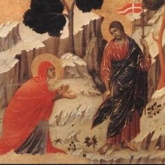 O Evangelho de João (20, 11-18) descreve que, morto Jesus, Maria Madalena permaneceu chorando junto ao túmulo, cuja pedra-porta havia sido retirada. Ao fitar o interior, não avistou o corpo de Jesus. Viu dois anjos. Perguntaram por que chorava. Ela respondeu: “Porque levaram o meu Senhor e não sei onde o colocaram.”