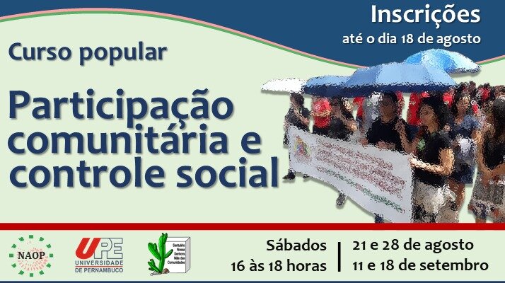 Olá pessoas, boa tarde!!!! Estão abertas inscrições para o curso Participação e Controle Social ofertados pelo Núcleo de Assessoria às Organizações Populares, em parceria