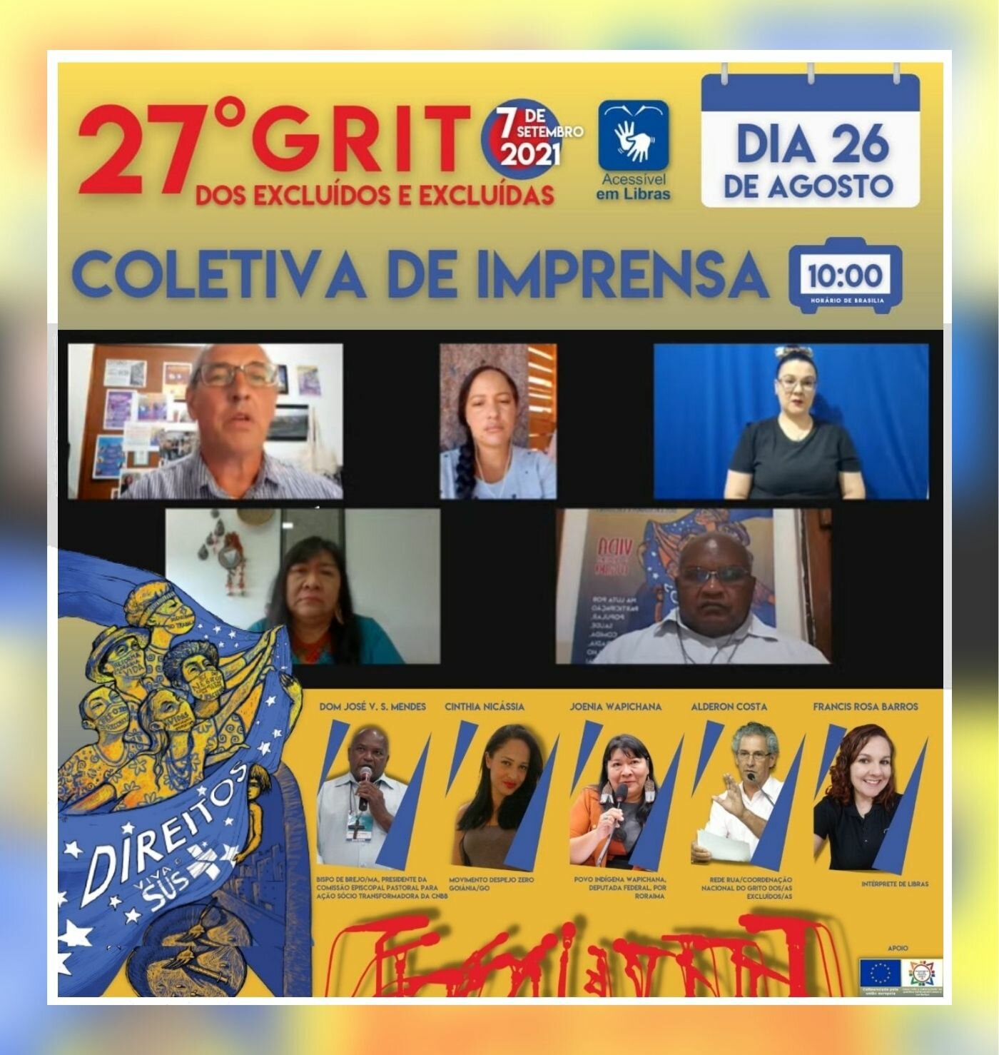 Aconteceu nesta quinta-feira, 26 de agosto de 2021, às 10 horas, em formato online, a Coletiva Nacional de Imprensa do 27º Grito dos Excluídos e Excluídas. Esta coletiva foi transmitida pelas páginas do Facebook, do Youtube do Grito dos Excluídos e em mais de 30 redes sociais que realizaram a transmissão cruzada. Tendo como tema Vida em Primeiro Lugar, a 27ª edição do Grito convoca todos e todas para lutar por participação popular, saúde, comida, moradia, trabalho e renda, já.