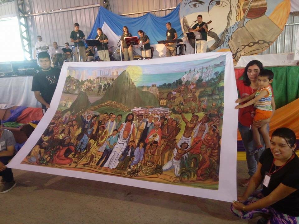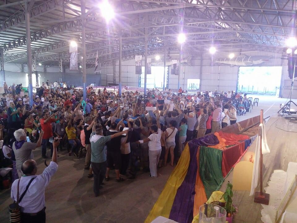 Después de alegrarnos por el encuentro y el compartir, nos preparamos para la Celebración de envío y regresar a nuestras comunidades fortalecidos a vivir el Proyecto liberador de Jesús.  Se lee la carta final del Encuentro a las Comunidades del país. Alwin Nagy y referentes de la Fundación Padre Ángel Misionero Popular entregan a las diócesis participantes del Encuentro y países del Cono Sur, Paraguay y Uruguay “El Paño de la Resurrección”: