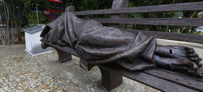 Imagem: Rio de Janeiro RJ 19 11 2018 Estátua Jesus sem teto, de autoria do canadense Timothy P. Schmalz, inaugurada no jardim da Catedral Metropolitana do Rio, mostra a escultura de Jesus Cristo como morador de rua no centro da cidade.foto Fernando Frazão/Agencia Brasil